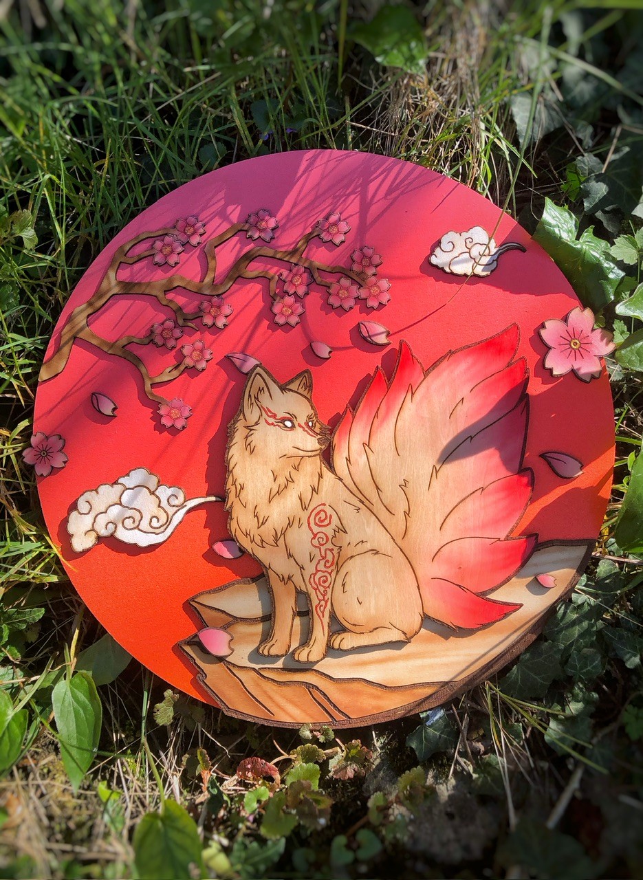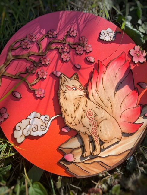 Création du motif, programmation, découpe et gravure CNC + laser, peinture et vernis par mes soins